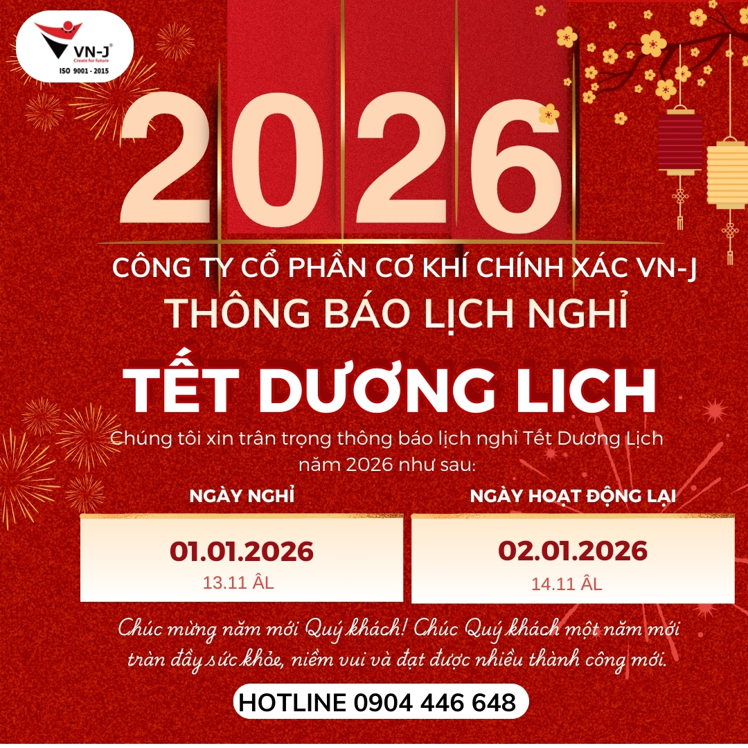 Nhân dịp năm mới 2026 sắp đến, Công ty Cổ phần Cơ khí Chính xác VN-J xin trân trọng gửi tới Quý khách hàng, Quý đối tác lời chúc mừng năm mới sức khỏe, an khang và thành công. Đồng thời, nhằm giúp Quý khách hàng và đối tác chủ động trong kế hoạch làm việc, hợp tác và liên hệ, VN-J xin thông báo lịch nghỉ Tết Dương lịch năm 2026 như sau.